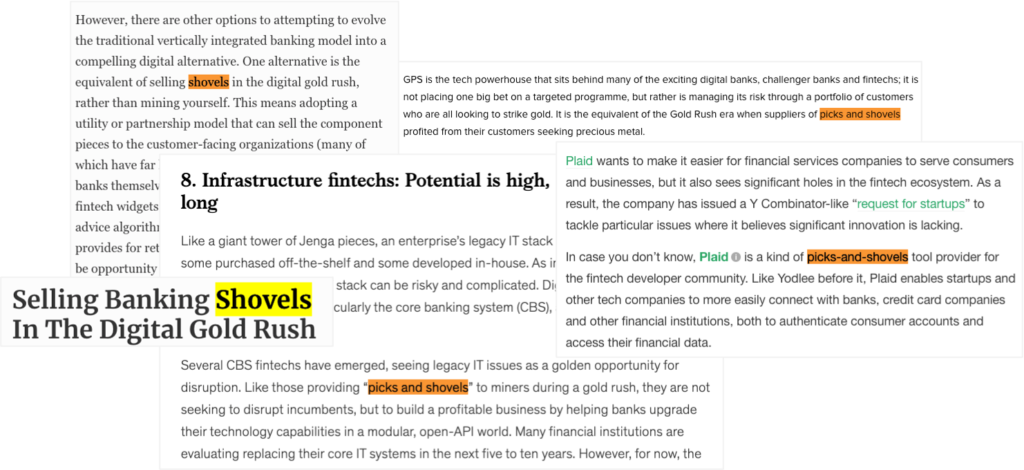 But, as an active investor in the embedded finance space, I feel the current trend of comparing fintech infrastructure to ‘picks and shovels’ falls short of communicating the real value and potential of such platforms.